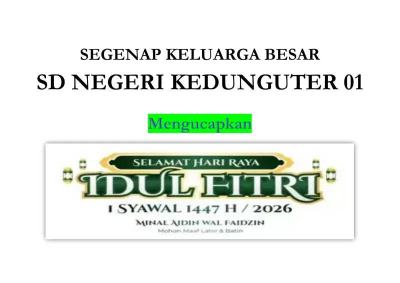 Kami Segenap keluarga besar SD Negeri Kedunguter 01 Mengucapkan "SELAMAT HARI RAYA IDUL FITRI 1447 H" Mohon maaf lahir dan bathin.